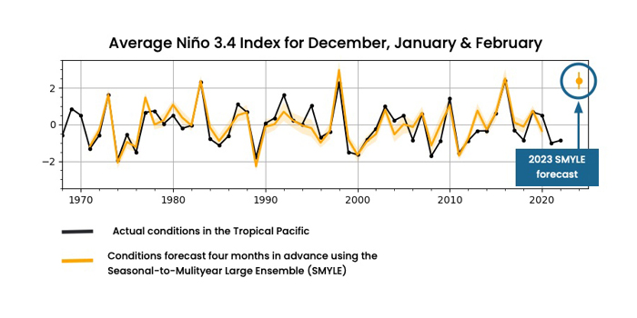 An initial analysis of SMYLE also revealed that the system did a remarkably good job of forecasting the occurrence and strength of El Niño and La Niña events. With an El Niño taking shape this autumn, the Earth System Prediction Working Group decided to run the system in real time in August 2023, producing a 20-member ensemble forecast for the upcoming winter.