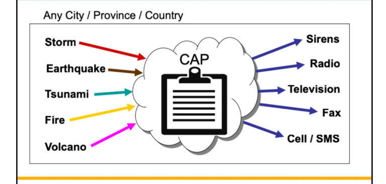 The Common Alerting Protocol (CAP) is a data format for exchanging public warnings of hazards such as floods, landslides, tropical cyclones, strong winds, drought and heat waves. It enables automated transmission of warnings over most communication platforms in order to better reach all parties in need of such information.