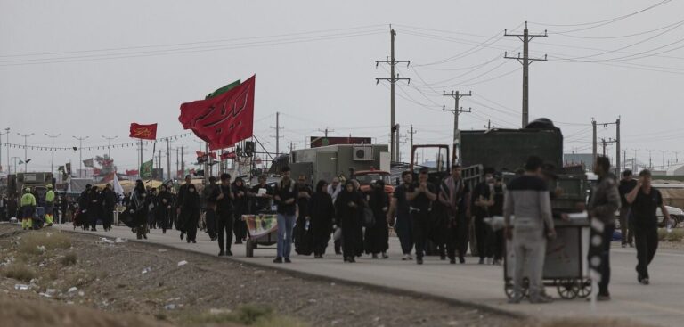 Pilgrims are exposed to the elements while traveling on foot to Karbala, Iraq, where they commemorate the martyrdom of Al-Hussain ibn Ali, the grandson of the Prophet Muhammad. On one popular route, pilgrims travel around 80km from Najaf, Iraq, and typically reach Karbala within one to three days. However, other routes can be as long as 500km.