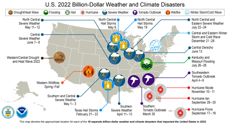 Last year, the US experienced 18 separate billion-dollar weather and climate disasters, leading to the deaths of at least 474 people. This tied 2022 in third place (with 2011 and 2017) for the highest number of disasters recorded in a calendar year, behind 2021 with 20 events, and 2020 with a record 22 separate billion-dollar events.
