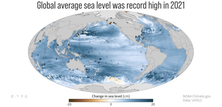 - Ocean heat and global sea level were the highest on record. The ocean sequesters the vast majority of the excess energy trapped in the Earth’s system by greenhouse gases and other factors; estimated at more than 90% over the past half-century. Global ocean heat content, measured from the ocean’s surface to a depth of more than 1,828m, continued to increase and reached new record highs in 2021. For the 10th consecutive year, global average sea level rose to a new record high and was about 97.0mm higher than the 1993 average — the year that marks the beginning of the satellite measurement record.