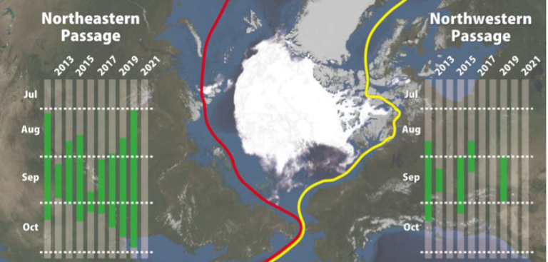 During the preceding 2020 season, in particular, the Northern Sea Route was open for the longest period ever, at 88 days, owing to the record-breaking high temperatures in the Arctic region. On the other hand, the summer temperature trends during 2021 were lower than usual in July, which is the usual period of melting. This caused less than the average amount of sea ice melting. As a result, sea ice remained in some areas of the Northern Sea Route even in September when the sea ice area should be the smallest, causing both the Northeast and the Northwest Passages to remain closed.