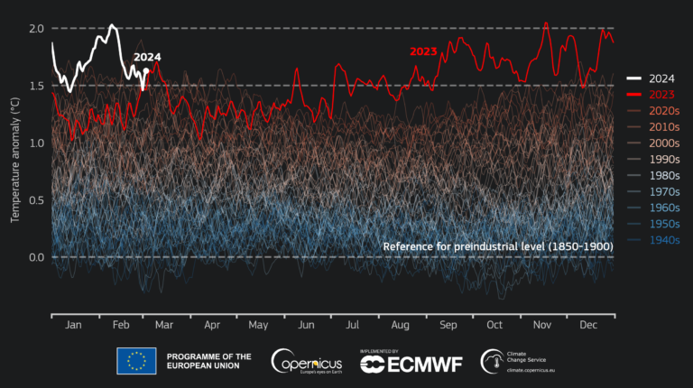The Copernicus Climate Change Service (C3S), implemented by the European Centre for Medium-Range Weather Forecasts on behalf of the European Commission with funding from the EU, has found that global sea surface temperatures reached a record high in February 2024.