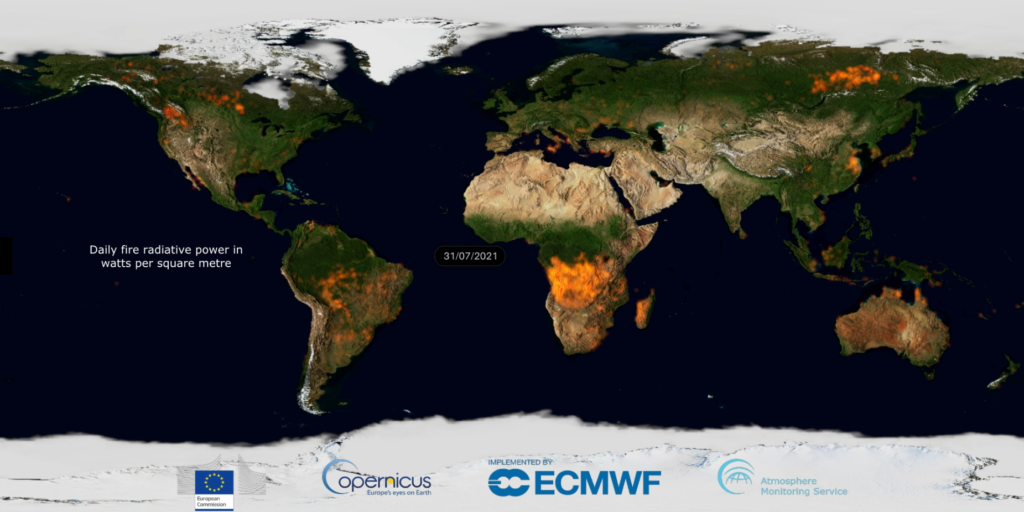 Implemented by the European Centre for Medium-Range Weather Forecasts (ECMWF) on behalf of the European Commission, with funding from the European Union, CAMS uses satellite observations to closely monitor active fires worldwide, providing estimated emissions and the impact on atmospheric composition and air quality.